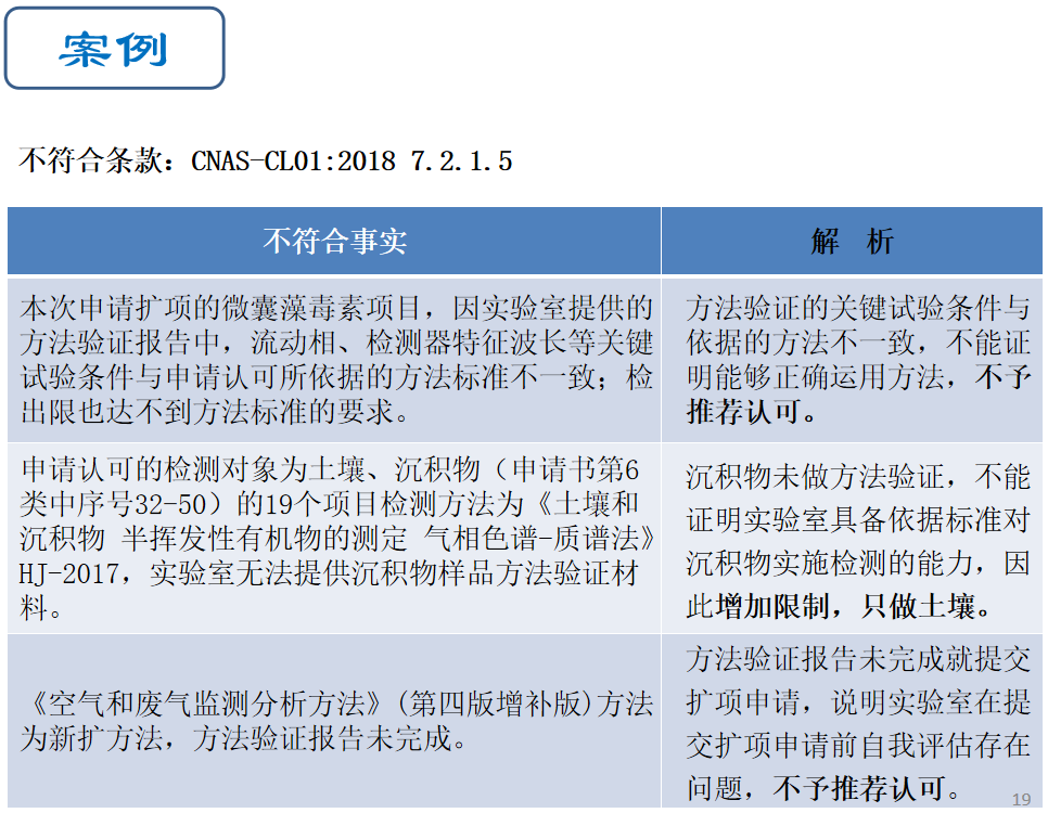 這2個不符合都是在進行試驗驗證時,在個別方面偏離了方法標準的要求。嚴格意義上說這不算是對標準方法的驗證,如果實驗室打算長期偏離標準方法操作,應按非標申請認可,并做方法確認。準則的7.2.2.1規定,對修改的標準方法要進行確認。對標準方法的驗證不應該有偏離標準要求的情況出現。