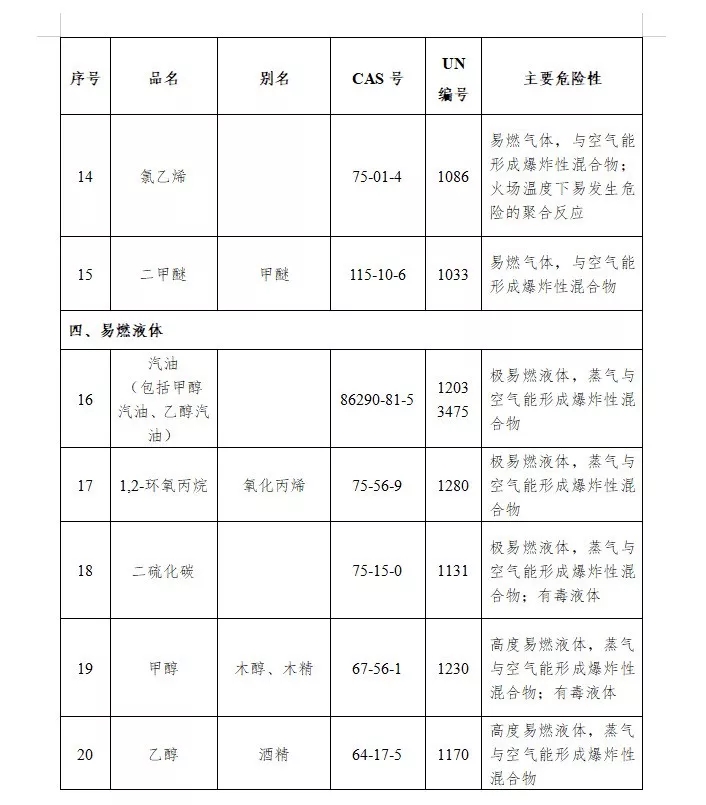 《目錄》列舉的特別管控危險化學品包括20類,分別是:硝酸銨[(鈍化)改性硝酸銨除外]、硝化纖維素(包括屬于易燃固體的硝化纖維素)、氯酸鉀、氯酸鈉、氯、氨、異氰酸甲酯、硫酸二甲酯、氰化鈉、氰化鉀、液化石油氣、液化天然氣、環氧乙烷、氯乙烯、二甲醚、汽油(包括甲醇汽油、乙醇汽油)、1,2-環氧丙烷、二硫化碳、甲醇、乙醇。